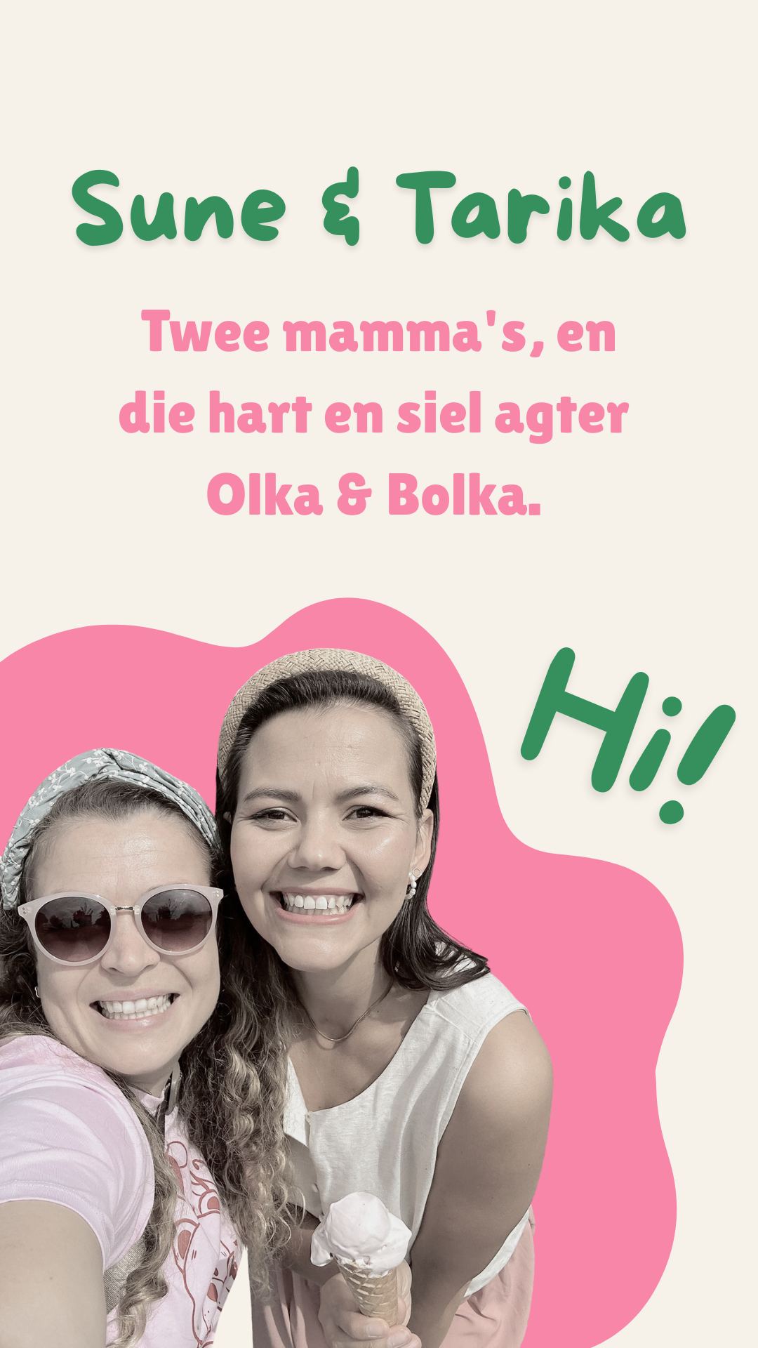Dit is ons, Sune en Tarika! Twee mamma’s, 4 klein kindertjies, en die gesigte agter Olka & Bolka.